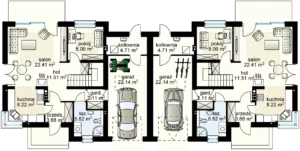 Projekt obejmuje 2 nowoczesne domy jednorodzinne w zabudowie bliźniaczej Segment A i B każdy na 5, 51ar działce z dojazdem z drogi gminnej z udziałami w drodze.