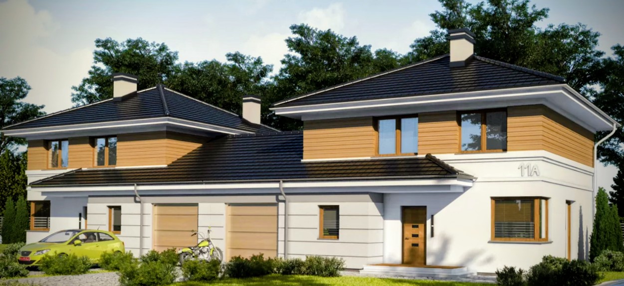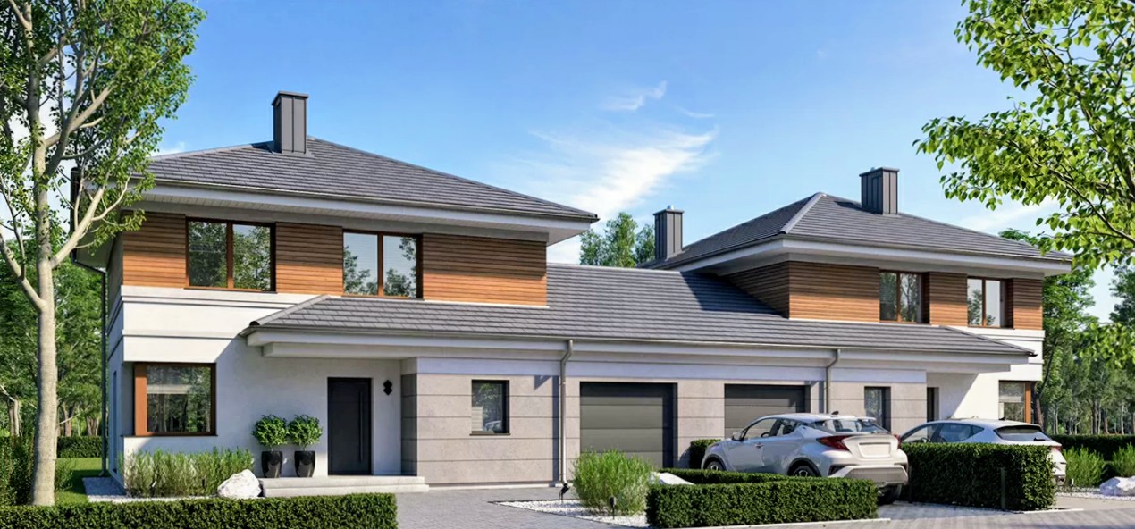 Projekt obejmuje 2 nowoczesne domy jednorodzinne w zabudowie bliźniaczej Segment A i B każdy na 5, 51ar działce z dojazdem z drogi gminnej z udziałami w drodze.