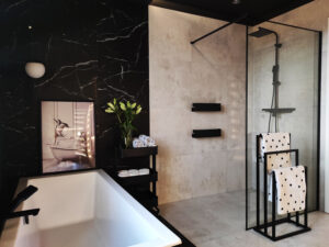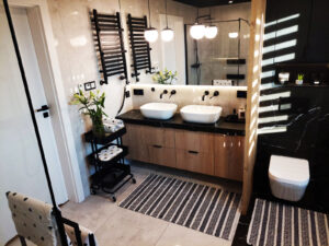 Główna łazienka znajdująca się na piętrze ma zarówno prysznic jak i wannę, dwie umywalki z szafką ,wc i bidet + szafki.