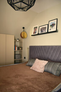 Na piętrze znajdują się 3 w pełni umeblowane sypialnie, gabinet i pojemna garderoba z oknem dachowym. Gabinet można w łatwy sposób prze aranżować na dodatkową sypialnię.