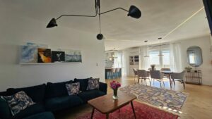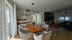 Salon posiada duże okna tarasowe z wyjściem do ogrodu, połączony jest z jadalnią i kuchnią. Meble kuchenne zostały wykonane na wymiar i wyposażona jest w sprzęty AGD: piekarnik, płytę indukcyjną, mikrofalówkę w zabudowie, zmywarkę, ekspres do kawy, dużą i pojemną lodówkę z kostkarką lodu.