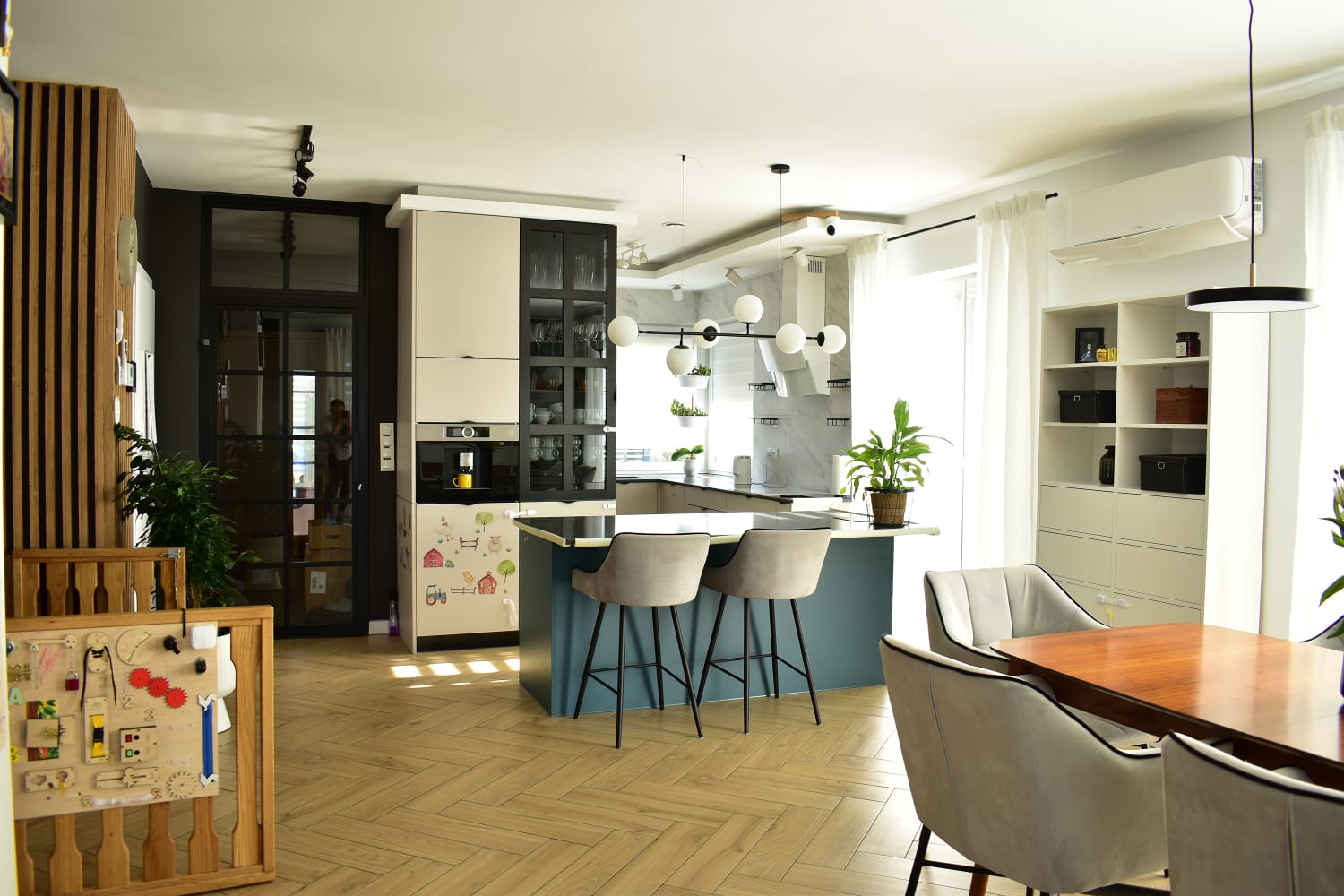 Salon posiada duże okna tarasowe z wyjściem do ogrodu, połączony jest z jadalnią i kuchnią. Meble kuchenne zostały wykonane na wymiar i wyposażona jest w sprzęty AGD: piekarnik, płytę indukcyjną, mikrofalówkę w zabudowie, zmywarkę, ekspres do kawy, dużą i pojemną lodówkę z kostkarką lodu.