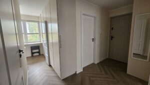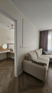 Mieszkanie jest w pełni wykończone i umeblowane, urządzone w eleganckim stylu z elementami drewna i klasycznymi glamour. Materiały wykończeniowe najwyższej jakości, meble na wymiar, stylowe dodatki – to wszystko sprawia, że wnętrze zachwyca estetyką i funkcjonalnością.